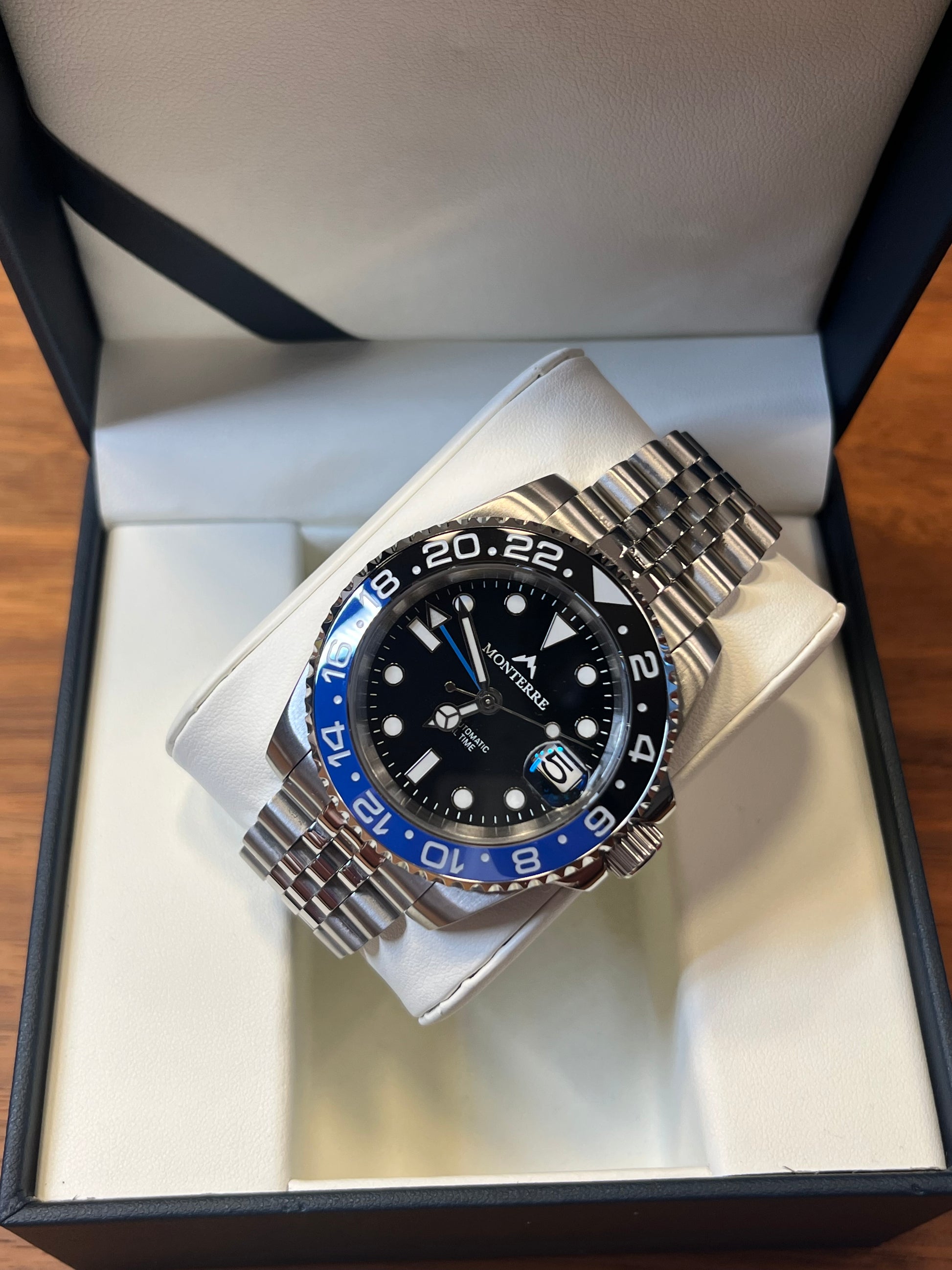 Inspiriert vom ikonischen GMT-Design und ausgestattet mit dem renommierten Seiko NH34 Automatik GMT-Uhrwerk, präsentieren wir die MONTERRE DARK KNIGHT GMT. Eine hochwertige Uhr mit dem Durchmesser 40mm, die die perfekte Verbindung zwischen Sportlichkeit und Eleganz darstellt.